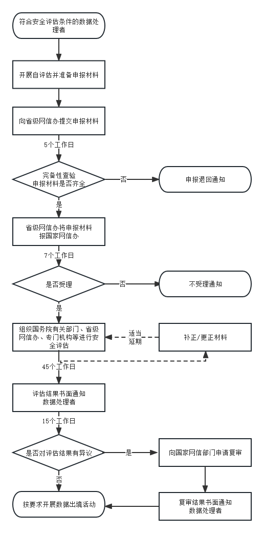 《评估办法》《数据出境安全评估申报指南(第一版)》对数据出境安全评估的申报流程作出了详细规定,具体流程及所需时间如下图所示: