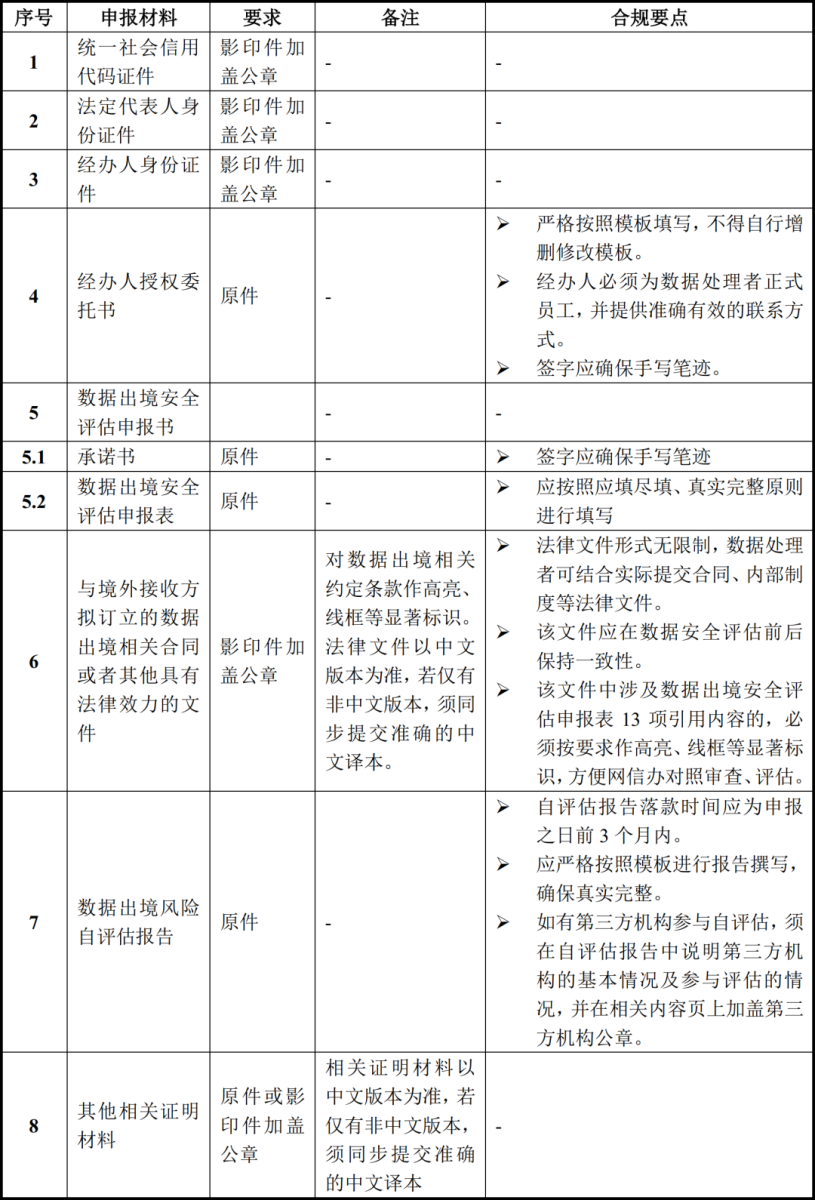 笔者根据《评估办法》《数据出境安全评估申报指南(第一版)》,结合各地网信办的实务问答,就申报材料及其中重点材料的合规要点分析如下: