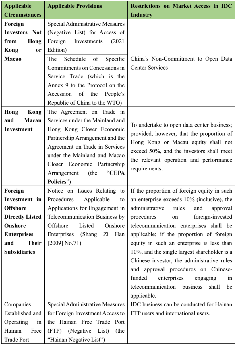 In our earlier article on the transaction structure of the foreign investment in IDC (i.e.《数字地产系列(四)——外商投资互联网数据中心(IDC)项目的交易结构建议》), we outlined the transaction structures applicable prior to the issuance of the MIIT Circular. This article aims to highlight the substantial conveniences and policy advantages that the MIIT Circular has introduced for foreign investment in IDC projects.